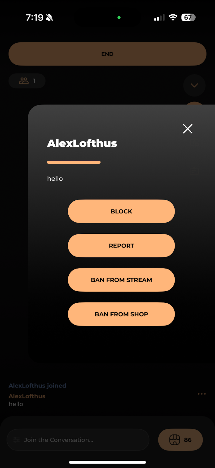 Loupe puts each seller in control of their stream moderation. To access moderation controls, click the ellipses next to the chat of the user you wish to Block, Ban from Stream, or Ban from Shop.