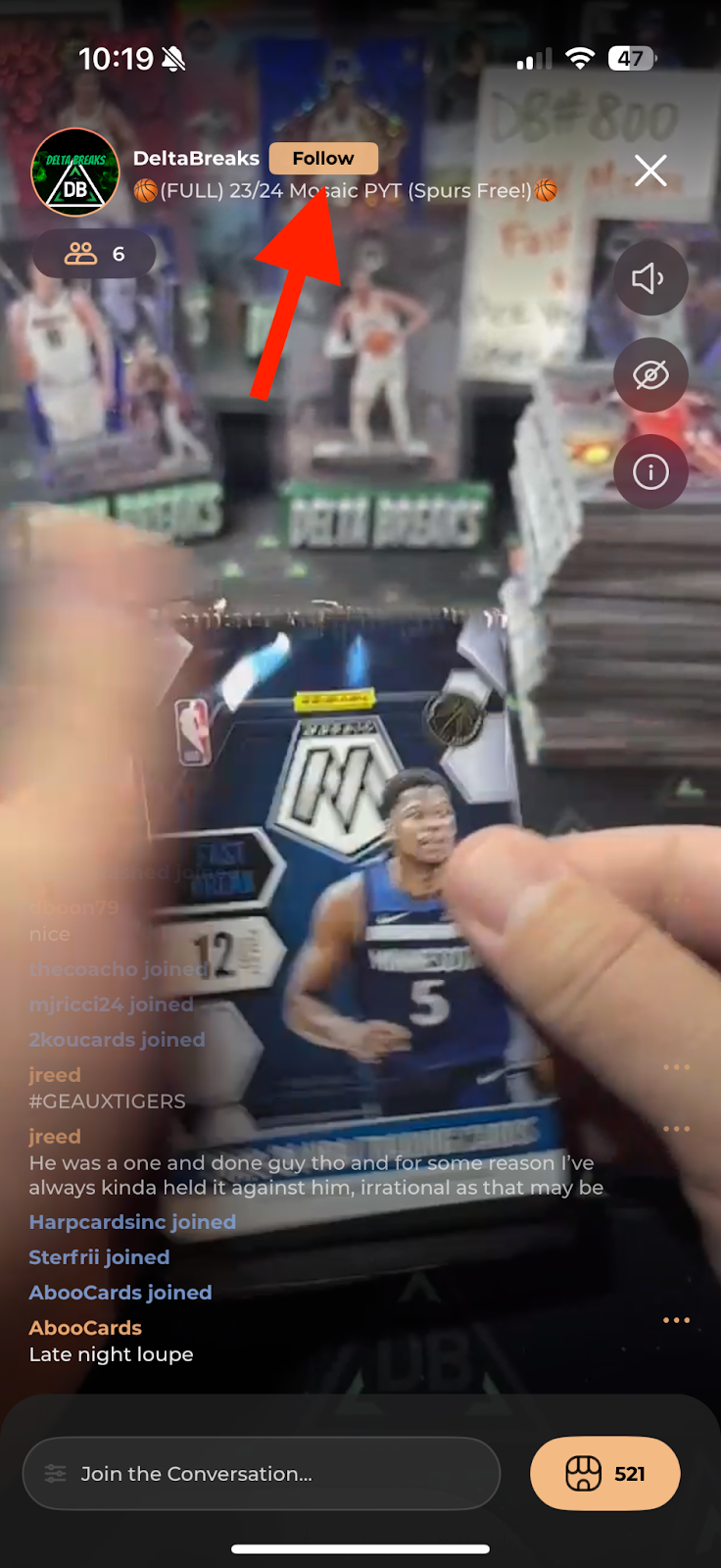 Instruct users to click the orange Follow button at the top of their screen. The Follow button will change to Following once a user is following your shop. Additionally, users may click the Stream Title at the top of their screen or the information (i) to access the Shop Profile and click the Follow button.