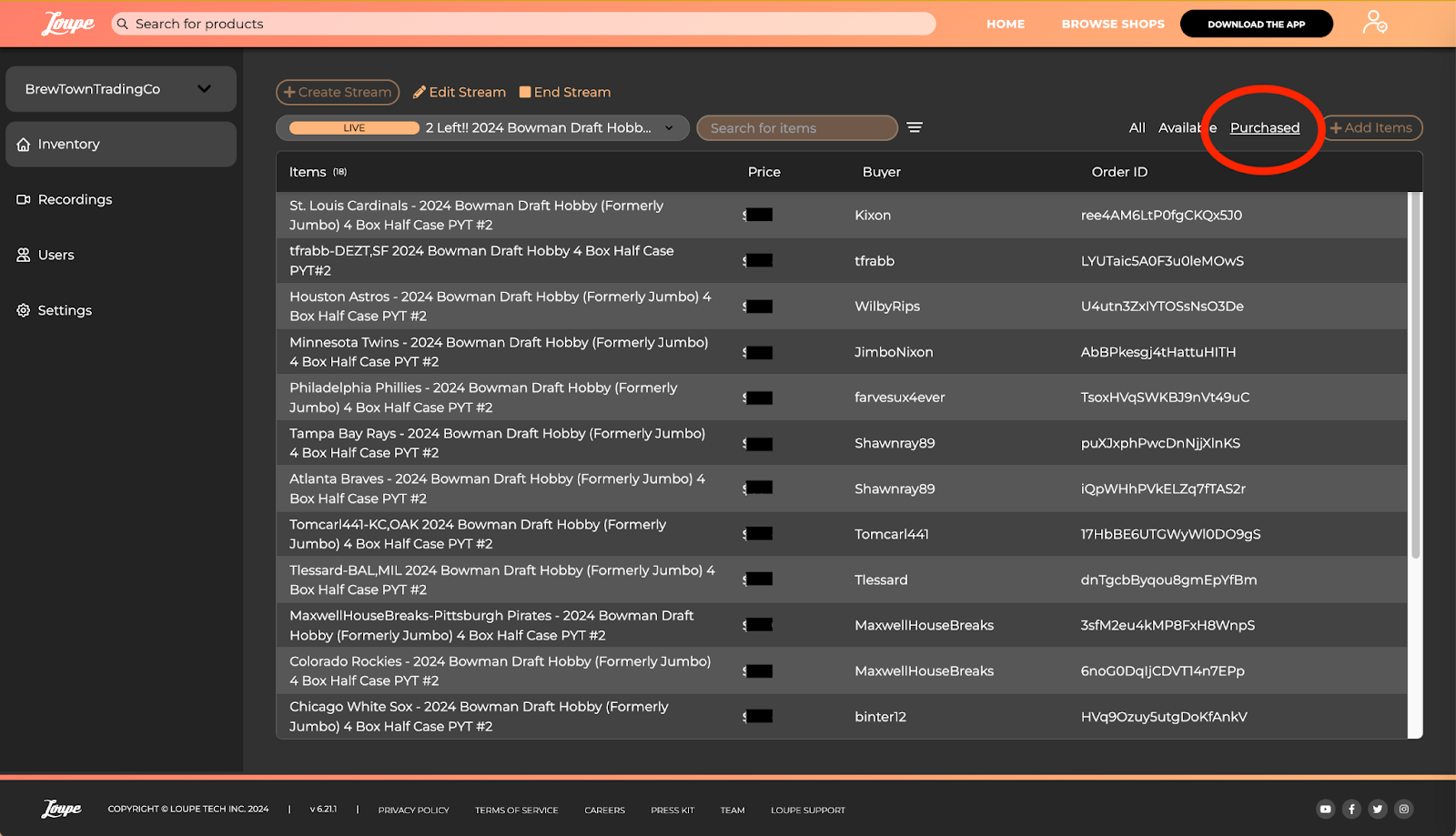 You can also view Purchased items, the Price, the Buyer name, & the Order ID. The Order ID shown in the Online Shop Portal matches the SKU for that order in Shippo.