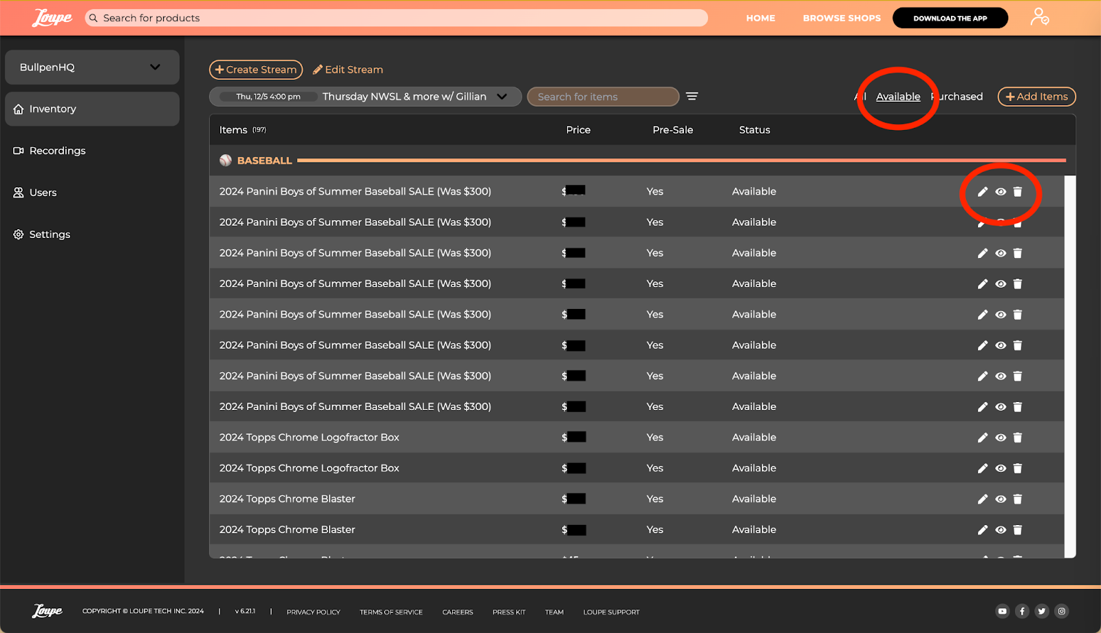 You can make real-time updates to your sales list while you’re live on the Online Shop Portal by selecting Available within your Online Shop Portal dashboard. Here, you can edit inventory items (using the pencil icon), Hide items from public view using the eye icon, or delete items using the trash icon.